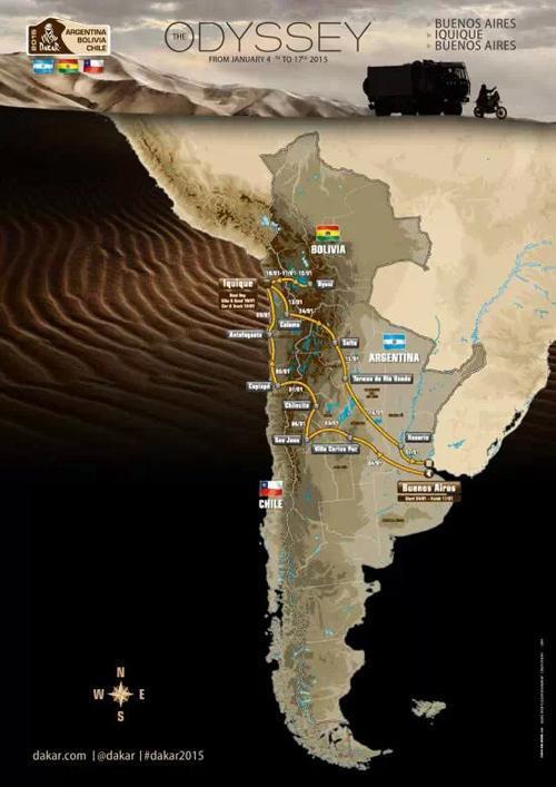 據了解,本屆達喀爾(第37屆)拉力賽將連續第七年在南美大陸上舉行,2015年的比賽重啟環形線路,1月4日比賽將從布宜諾斯艾利斯出發,向西北到達智利北部伊基克后折返,17日再回到阿根廷首都結束全部比賽。將有414輛賽車出戰達喀爾拉力賽,全程超過9000公里,賽段橫跨阿根廷,智利和玻利維亞三個國家。