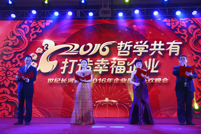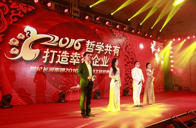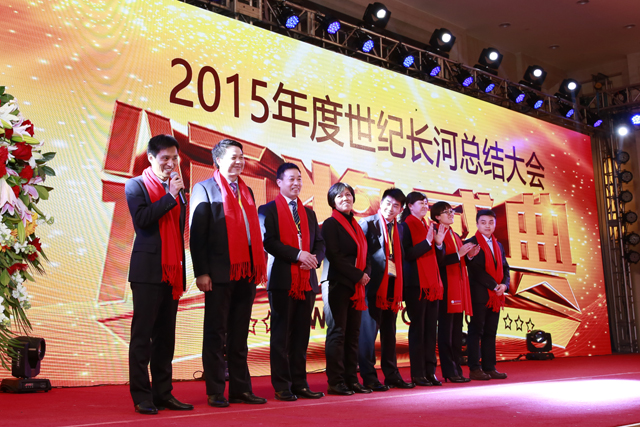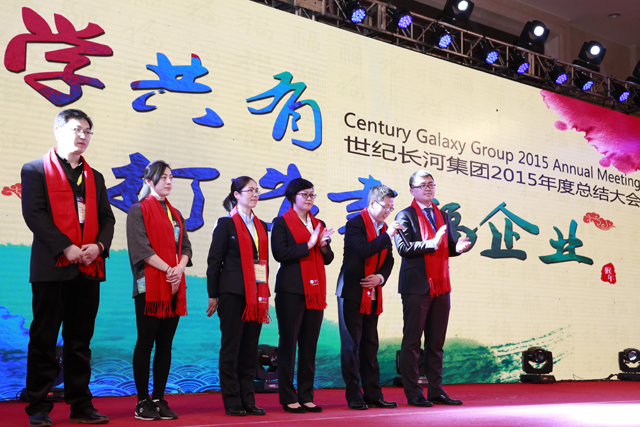“Make use of philosophical thought to build happy enterprise.” On Feb. 27, 2016, 2015 annual summary of Century Galaxy Group was held in Huabei Hotel in Beijing. The chairwoman Ms. Guo Meiling, the president Mr. Zhao Qi, the vice-president Ms. Zheng Baowen and the general manager Guo Xinkai attended the summary. The other people who attended the summary included the head of group headquarters, each branch company and project department, staff representatives and special guests.